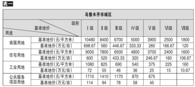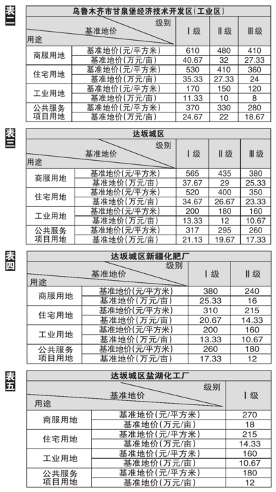 (二)基准地价标准,具体详见表二、表三、表四、表五 备注:细分用途详见乌鲁木齐市政府门户网站(http://www.urumqi.gov.cn/)
