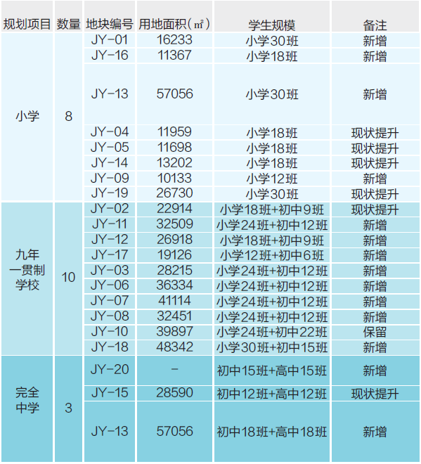 基础教育:全覆盖。规划幼儿园34 所、小学8 所、完全中学3所、九年制学校9所、十五年制学校1所。