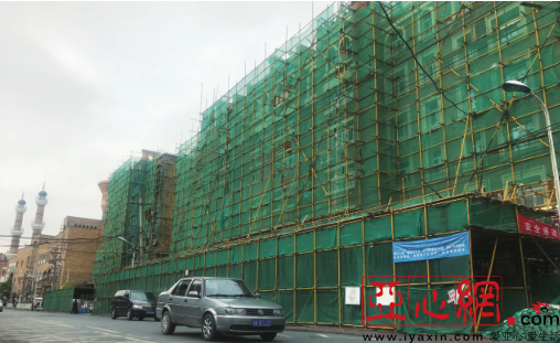 5月14日,新疆国际大巴扎旁的楼体已搭建了施工架。