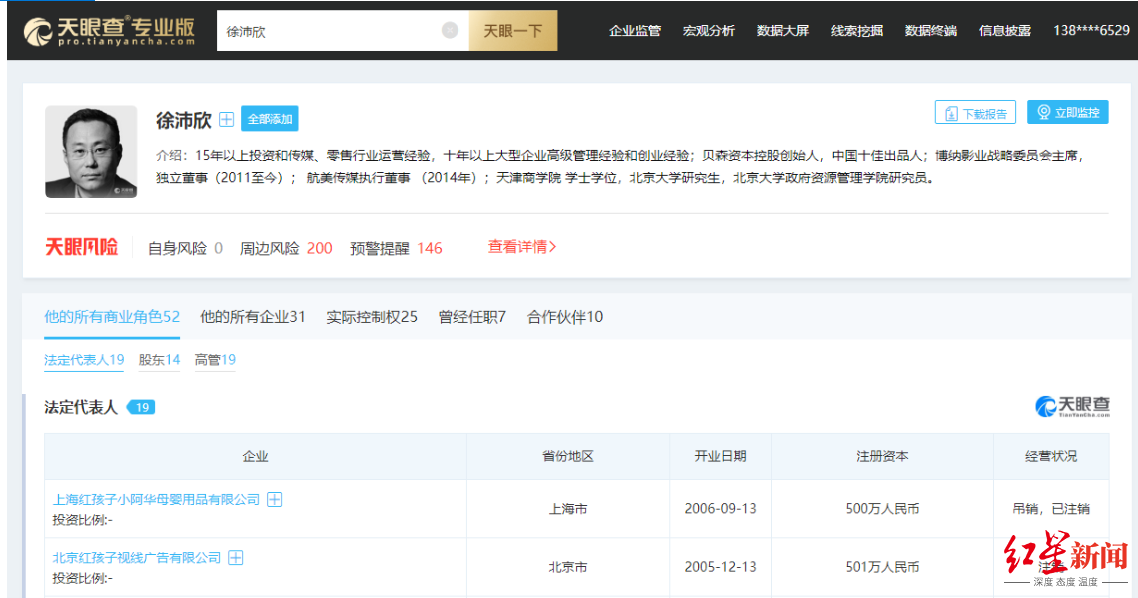 天眼查APP显示,徐沛欣曾投拍过《乔家大院》等耳熟能详的电视剧,还是曾经的母婴电商龙头红孩子的创始人之一。
