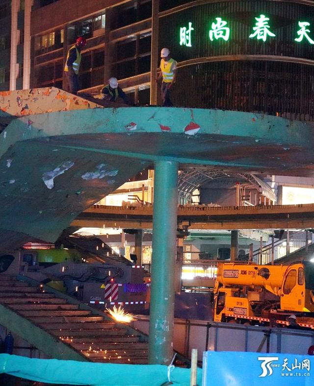 7月3日22时许,乌鲁木齐市大十字天桥上,施工人员在桥上作业。